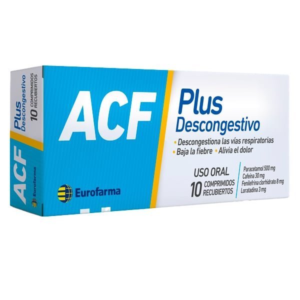 Acf Plus Descongestivo 10 comprimidos es una asociación de analgésicos antipiréticos o AINE, junto con antihistamínicos de acción H1, antitusígenos, broncodilatadores y descongestivos vasoconstrictores como efedrina, pseudoefedrina, fenilefrina o fenilpropanolamina, que contribuyen a la reducción de la hiperemia tisular, el edema y la congestión nasal.