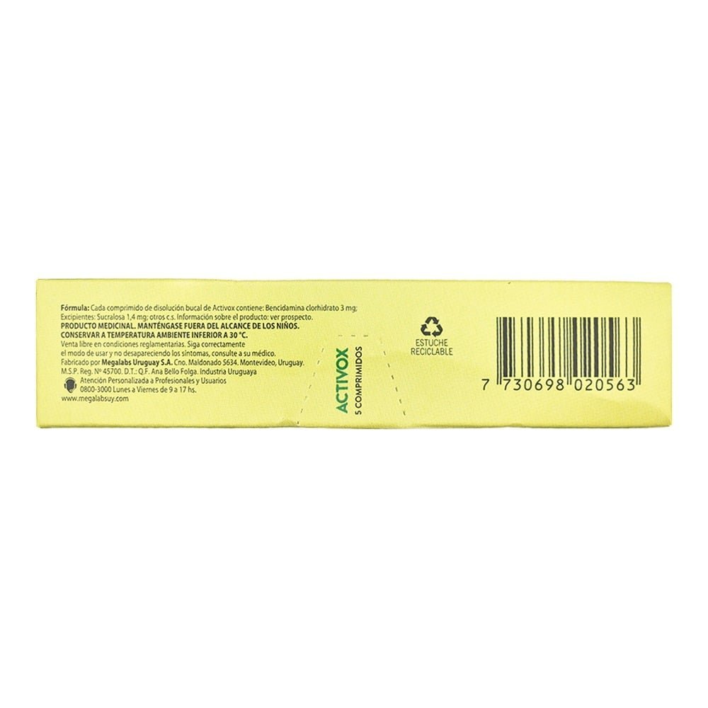 Activox son comprimidos bucodispersables de sabor menta-mentol que contienen bencidamina clorhidrato (3 mg) junto con partículas refrescantes. Este producto está concebido para aliviar el dolor y la inflamación en la mucosa oral, bucofaringea y encías, actuando como un anestésico y antiseptico local. Gracias a su formulación de rápida disolución, los comprimidos se desintegran en la boca, lo que facilita su administración y optimiza el efecto en la zona afectada.