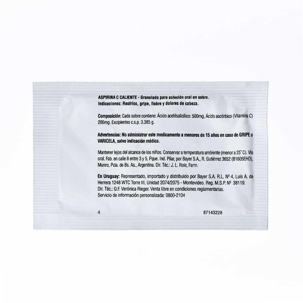 Aspirina C Caliente 1 Sobre (ácido acetilsalicilico, ácido ascorbico) es una bebida efervescente de sabor limón diseñada para aliviar síntomas asociados al resfío y a la gripe, como fiebre, dolor de cabeza y malestar general. Su formulación incluye aspirina, actuando como analgésico y antipirético, y vitamina C, que contribuye a fortalecer el sistema inmunológico. Se disuelve en agua caliente y está indicada para adultos y personas mayores de 15 años. No debe utilizarse en el último trimestre del embarazo ni en casos de trastornos hemorrágicos.