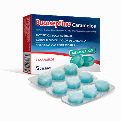 Bucoseptine en bolsas de 9 caramelos, productos orofaringeos antiinfecciosos disponibles en forma de aerosol, solución topical, gargarismos, caramelos y tabletas para disolver.