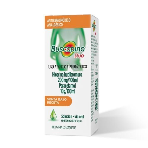Buscapina Duo Gotas 20 ml es una preparación compuesta que incluye paracetamol, formulada como un antiespasmodico con acción analgésica.