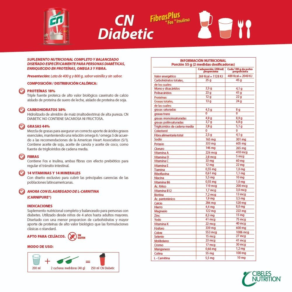 CN Diabetic Vainilla 40-00 gr es un suplemento nutricional completo y equilibrado, diseñado especialmente para personas con diabetes. Enriquecido con proteínas de alto valor biológico, ácidos grasos omega 3 y fibra, apoya el control glucémico y atiende las necesidades nutricionales de quienes siguen una dieta especial. Esta fórmula es adecuada para todas las edades, desde los 4 años hasta adultos mayores.