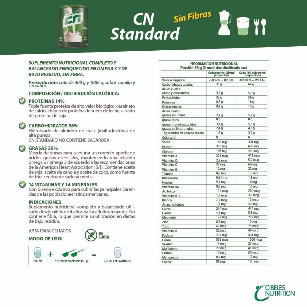 Producto: cn standard sin sabor 400 gr Suplemento nutricional completo y equilibrado, enriquecido con Omega 3 y de bajo residuo, sin inclusión de fibra.