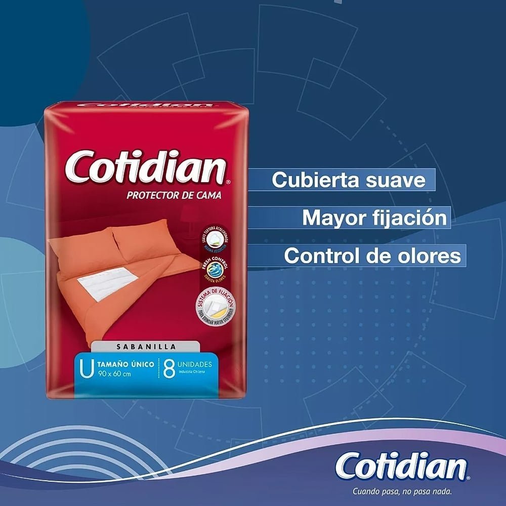 Los protectores de cama Cotidian, disponibles en 8 unidades, ofrecen una solución integral para la protección y confort en cualquier superficie de descanso. Gracias a su sistema de fijación seguro y su capacidad para controlar los olores, garantizan discreción y comodidad, manteniendo la piel seca y protegida. Cada protector tiene un tamaño único de 90 cm por 6 0 cm.