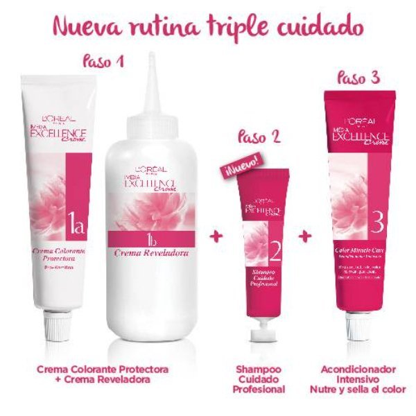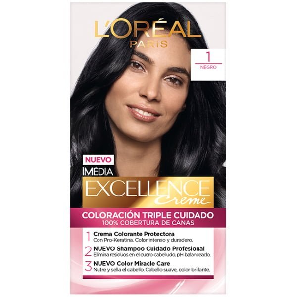 Excellence Creme 1 es un producto de coloración permanente para cabello negro que ofrece cobertura total de las canas, junto con brillo y suavidad. Su fórmula de triple cuidado protege el cabello durante todo el proceso. Es fácil de aplicar en casa y incluye un tratamiento acondicionador.