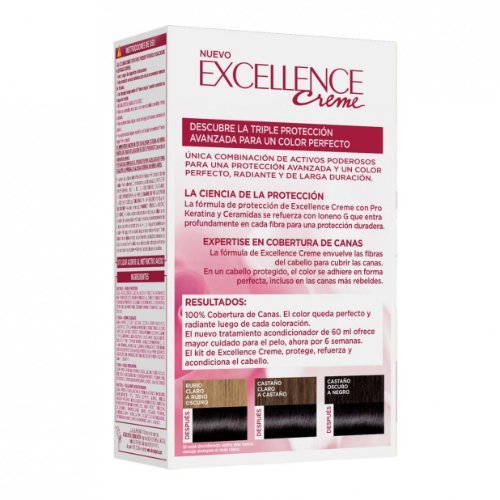 Excellence Creme 3 es un producto de coloración del KIT de L’Oréal Paris diseñado para mujeres que buscan una cobertura completa de 100% de las canas, mientras se proporciona cuidado profundo al cabello.