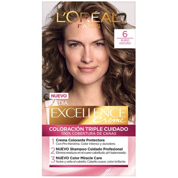 Excellence Creme 6 es un producto de coloración del KIT de L’Oréal Paris diseñado para mujeres que buscan una cobertura completa de 100% de las canas, mientras se proporciona cuidado profundo al cabello.
