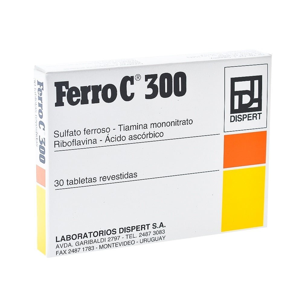 Ferro C 300 mg 30 comprimidos es un preparado antianémico que integra sulfato ferroso heptahidrato (300 mg), tiamina mononitrato (0,6 mg), riboflavina (1,5 mg) y ácido ascorbico (16,5 mg). Este fármaco está concebido para tratar y prevenir anemias causadas por deficiencia de hierro, ya que la vitamina C presente en su fórmula favorece la absorción del hierro. Además, su composición enriquecida incluye vitaminas esenciales que apoyan el correcto funcionamiento del organismo.
