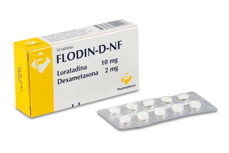 Flodin D NF 10 comprimidos contiene una asociación antialergica de loratadina, un antihistamínico de acción en el receptor H1, junto con dexametasona.