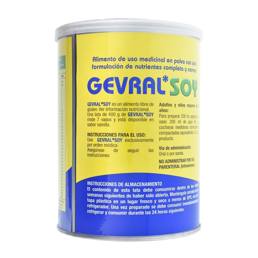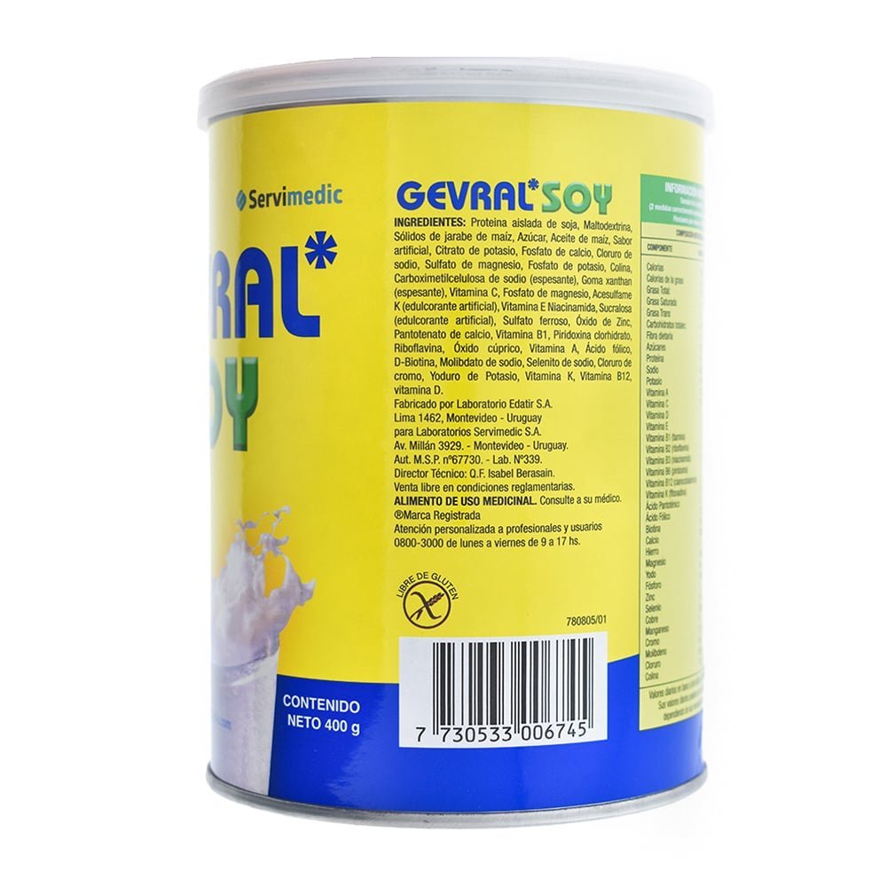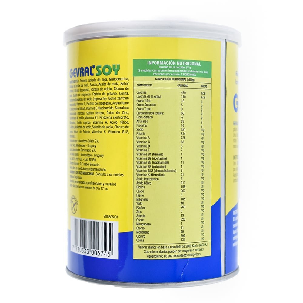 Gevral Soy 400 gr es una preparación rica en proteínas y aminoácidos, que puede incluir además vitaminas, minerales y otros macronutrientes.