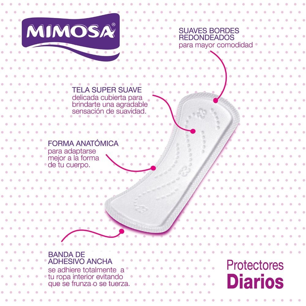 El Protector Diario Mimosa en formato de 60 unidades representa una solución práctica y económica para tu higiene intima diaria. Gracias a su diseño anatomico, se adapta de forma perfecta al cuerpo, ofreciendo frescura, comodidad y protección durante todo el día. Diseñado para uso diario, no provoca irritaciones y mantiene constantemente la sensación de limpieza.