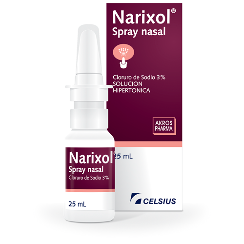 Narixol Espray Nasal 25 ml es una solución salina que, al ser aplicada localmente, fluidifica y facilita la eliminación y expulsión de las secreciones mucosas nasales.