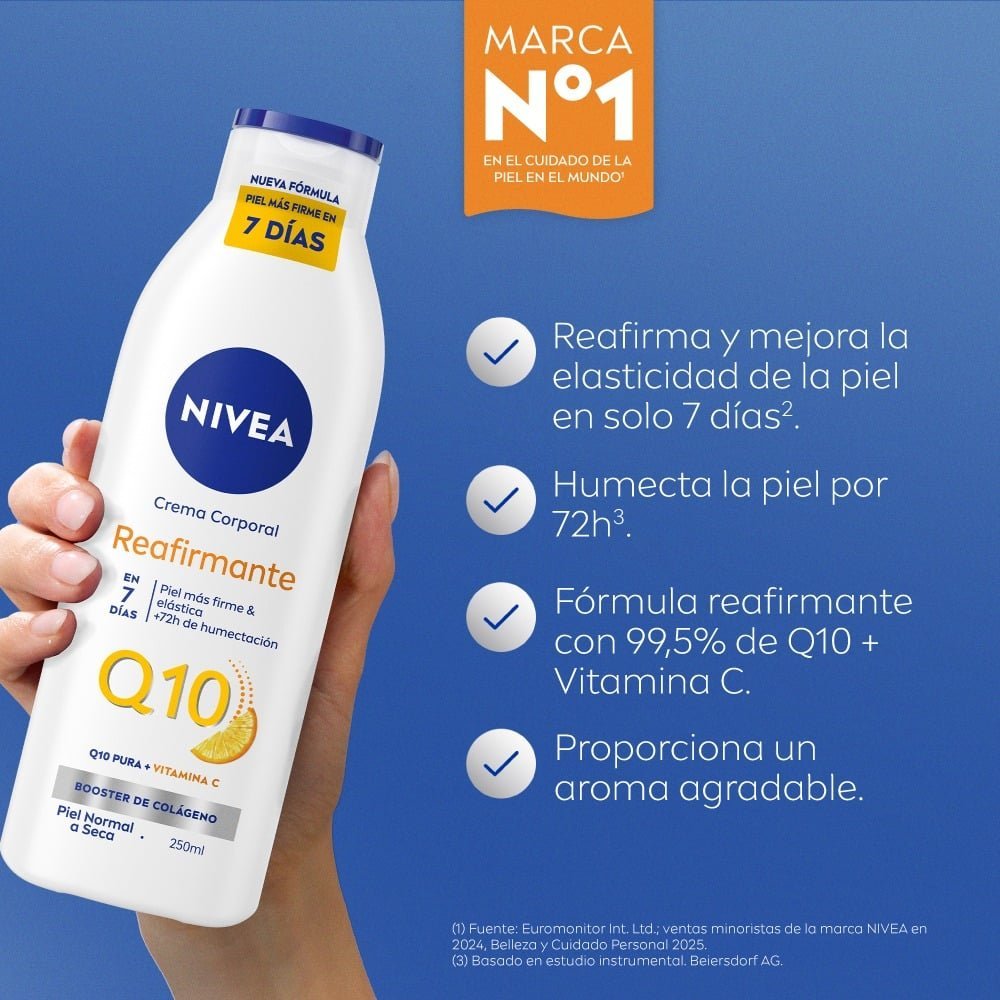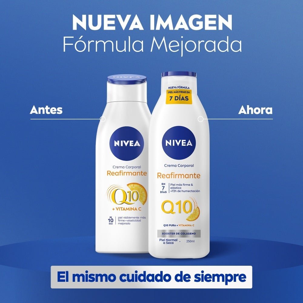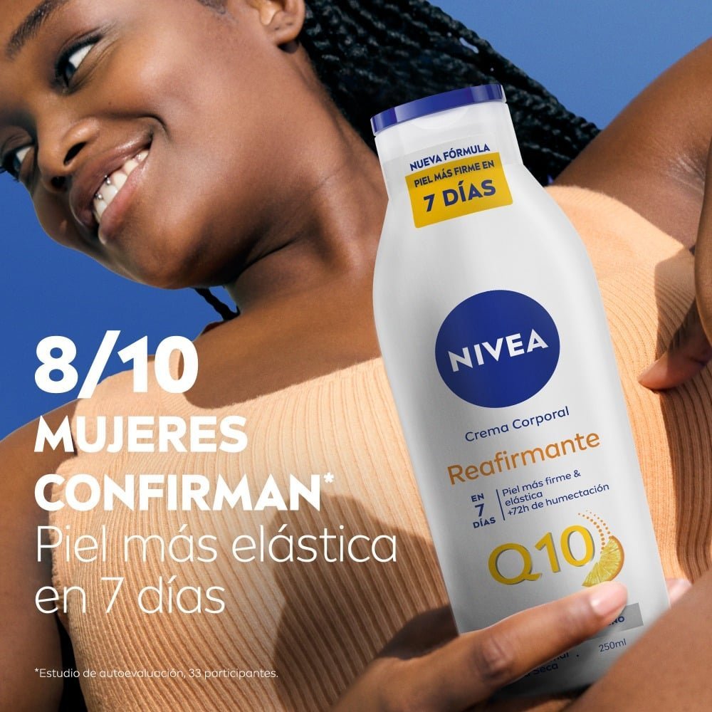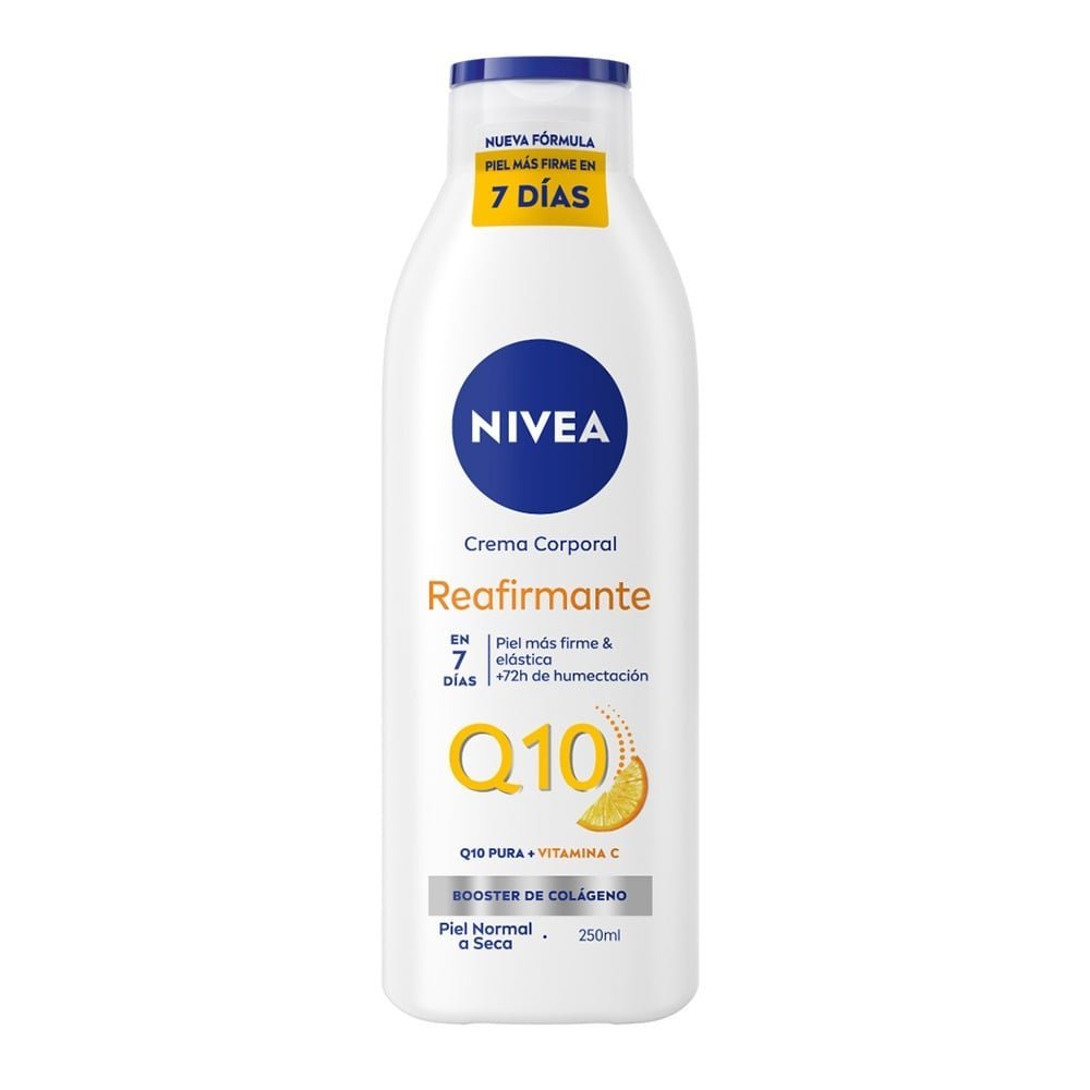 Nivea Body Cr Reafirmante Q10 Plus 250 ml es un producto que hidrata intensamente y contribuye a mejorar la firmeza y elasticidad de la piel en un periodo de dos semanas.