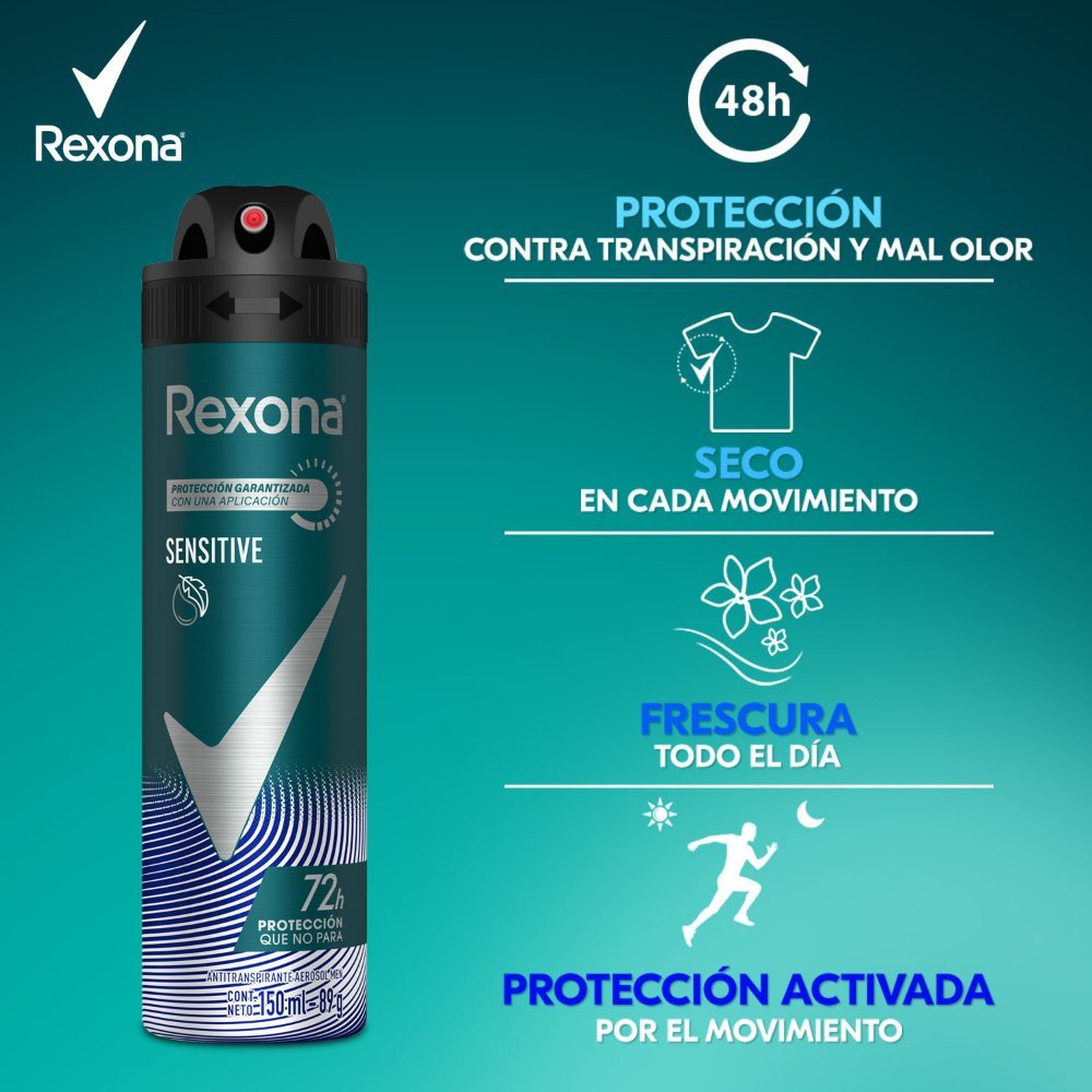 Rexona Desodorante En Aerosol Men Sensitive 150 ofrece 72 horas de protección contra la transpiración y el mal olor, cuidando la piel de las axilas con ingredientes específicos para pieles sensibles. Su fragancia masculina reconfortante, junto con su fórmula sin etilico, asegura frescura y comodidad durante todo el día.