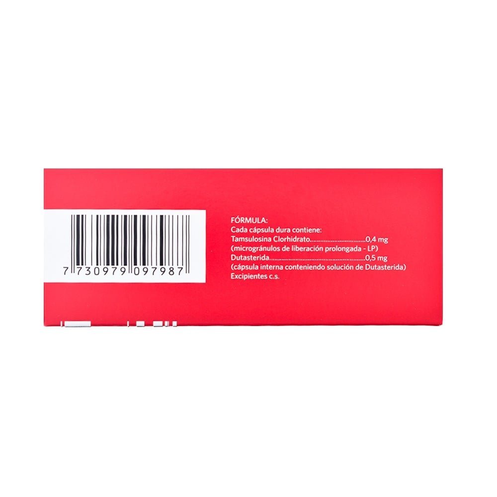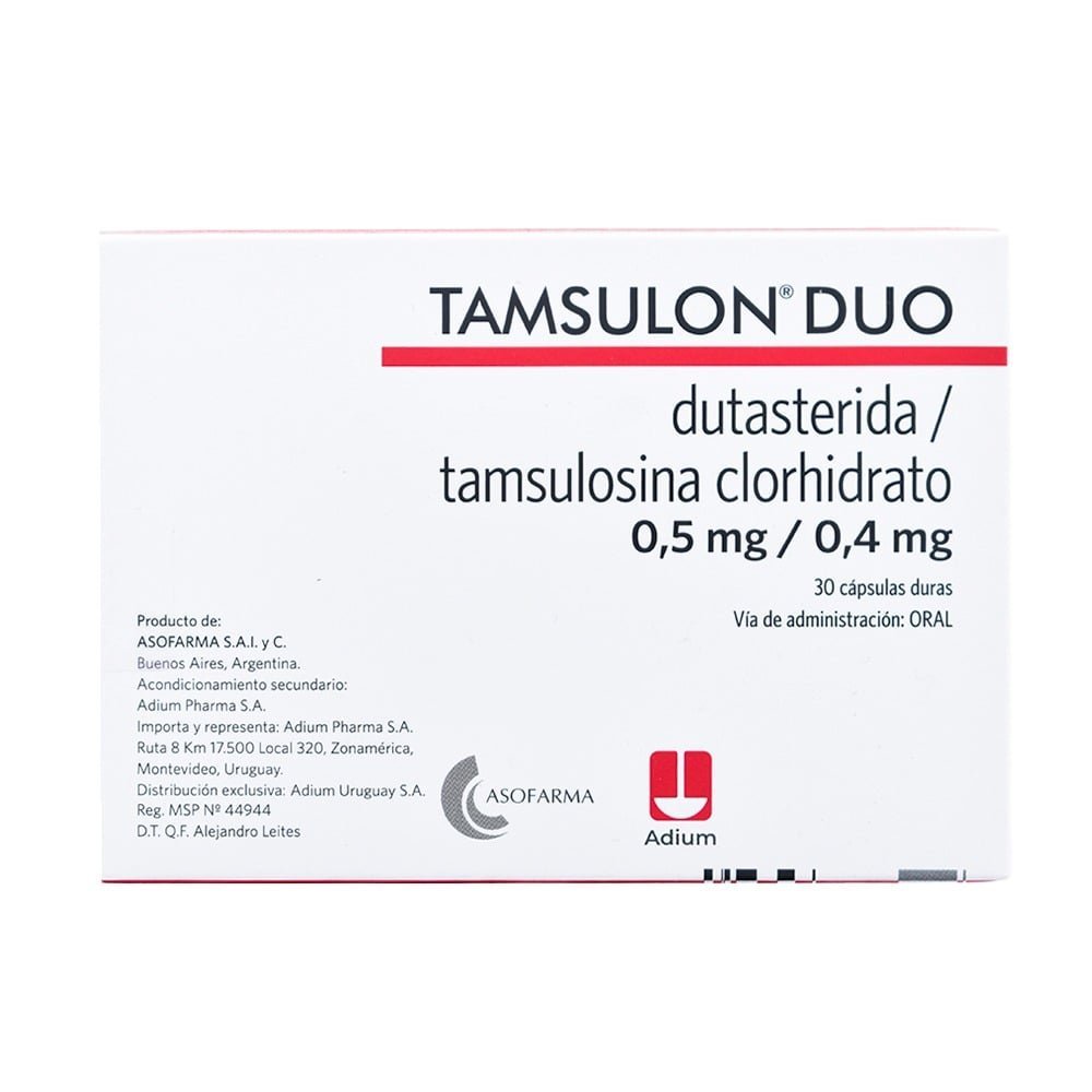 Tamsulon Duo 30 comprimidos es un medicamento en cápsulas de liberación prolongada que combina tamsulosina clorhidrato (0.4 mg) y dutasterida (0.-5 mg). Esta asociación ejerce un efecto descongestivo prostatico: la tamsulosina, inhibidor (alpha)-adrenergico, relaja las fibras musculares del cuello vesical, mientras que la dutasterida, inhibidor de la 5-alfareductasa, reduce la conversión de testosterona en dihidrotestosterona, lo que contribuye a aliviar los síntomas obstructivos urinarios.